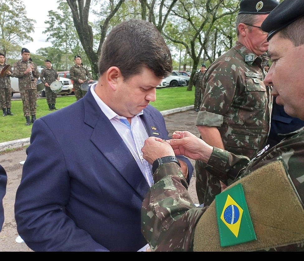 O presidente da Associação dos Arrozeiros, Gustavo Thompson Flores, recebeu o diploma de Colaborador Emérito e foi condecorado com a medalha do patrono do Regimento, Marechal José de Abreu.