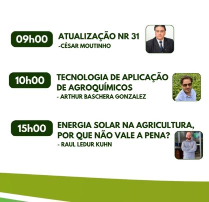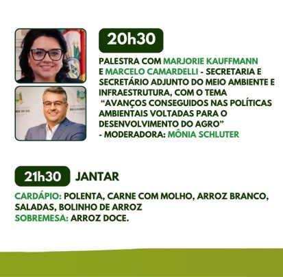 O segundo momento, às 20h30min, palestra com Marjorie Kauffmann e Marcelo Camardelli, respectivamente secretária e secretário adjunto do Meio Ambiente e Infraestrutura que vão abordar o tema “Avanços conseguidos nas políticas ambientais voltadas para o desenvolvimento do Agro”, tendo como moderadora Mônia Schluter.