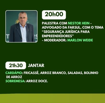 Palestras da noite, às 20h, a participação do dr. Nestor Hein, advogado da Farsul, que vai focalizar “Segurança Jurídica para Empreendedores”, tendo como moderador Marlon Weide.