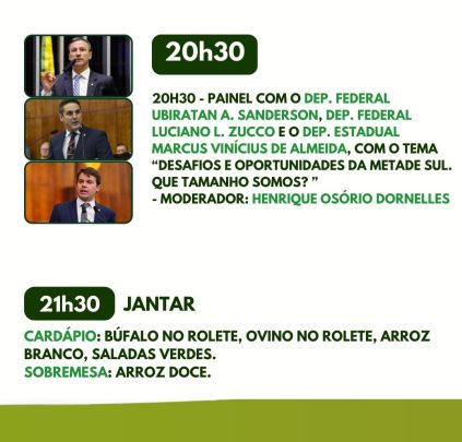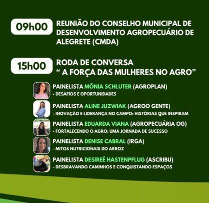 Para a quinta-feira,1º.de agosto, às 9h haverá reunião do Conselho Municipal de Desenvolvimento Agropecuário de Alegrete. Às 15h, haverá uma roda de conversa sobre “A força das mulheres no Agro”, com os seguintes painéis: às 15h15min, painelista Mônia Schluter (Agroplan), “Desafios e Oportunidades”; às 15h45min, painelista Aline Juzwiak(Agro Gente), “Inovação e Liderança no Campo: histórias que inspiram.” Às 16h15min,painelista Gyovana Torres( Dipo Agronegócios), “Fortalecendo o Agro: uma jornada de sucesso”.