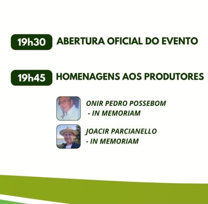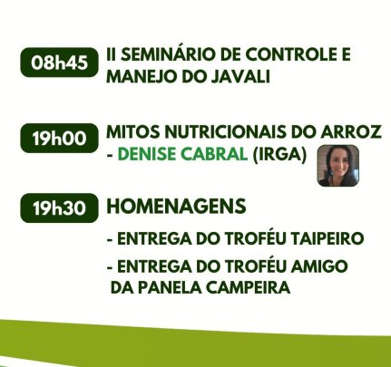 Na quarta-feira, dia 31, num primeiro momento, às 19h30min, a apresentação dos resultados do Projeto Agro verde oliva e entrega dos certificados aos participantes. Logo após, apresentação dos resultados do Núcleo de Assistência Técnica (NATE) IRGA nos anos 23/24 e a entrega do Selo Ambiental, a cargo de Ivo Mello, coordenador do 9º. NATE/IRGA Alegrete.