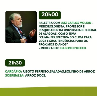Às atividades no Parque iniciarão oficialmente nesta terça-feira, durante o dia e noite, indo até sexta-feira. Um palco novo, com 11 metros já está montado. Para a primeira noite, dia 30, o professor Luiz Carlos Molion, meteorologista da Universidade Federal de Alagoas, que já esteve no ano passado e encantou com sua palestra sobre o clima.Ele vem abordar, desta vez, sobre Perspectivas para o Clima para 2024 e tendências para os próximos 10 anos. Será moderador Gilberto Pilecco.